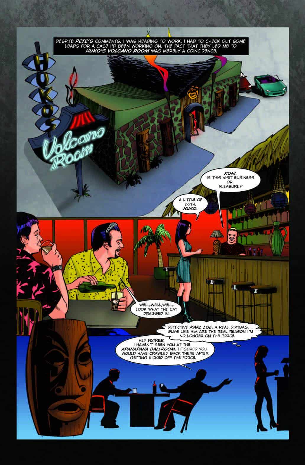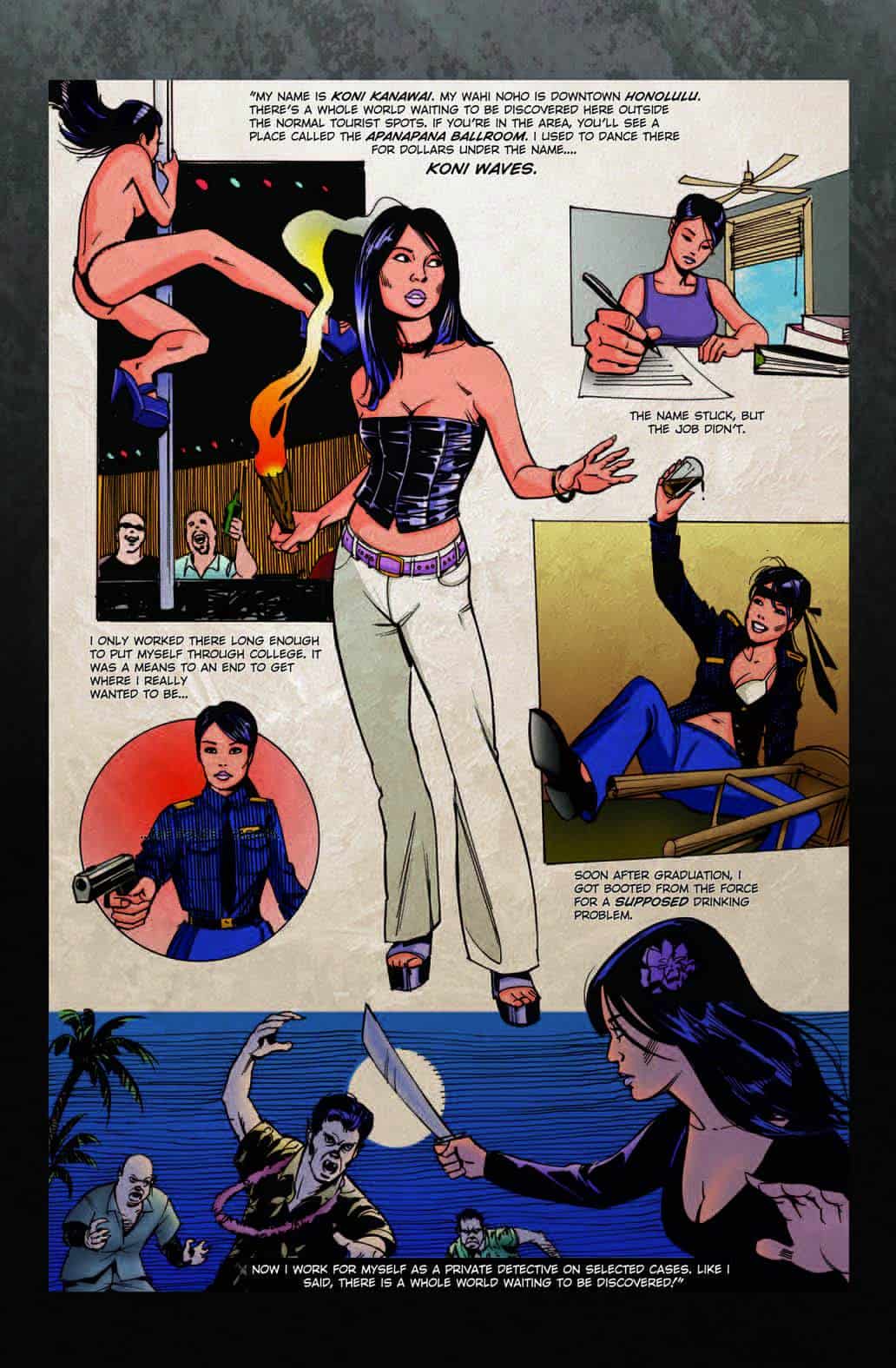KONI WAVES introduces private detective Koni Kanawai, an ex-cop in Honolulu, Hawaii who worked her way through college as a dancer at the Apanapana Ballroom. When a drinking problem gets her booted from the force, Koni starts her own detective agency. With the aid of Pete, her surf buddy, Krystal, a colleague from her dancing days, and Huko, the owner of her favorite watering hole, Koni encounters a series of supernatural events that leads her to discover a dark side of her island not seen in the usual tourist spots.